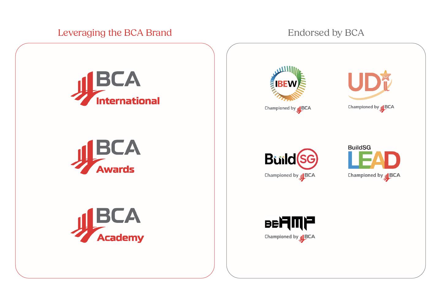 Tangible developed and tested hypotheses for the presentation of their Lines-of-Business and the BCA brands (e.g., BCA Academy), BCA sub-brands (e.g., BCA awards) and those standalone brands that BCA drove (e.g., Build SG). The result was a clear brand architecture and decision trees that allow BCA to align their brands and develop new brands with clarity and objectivity.